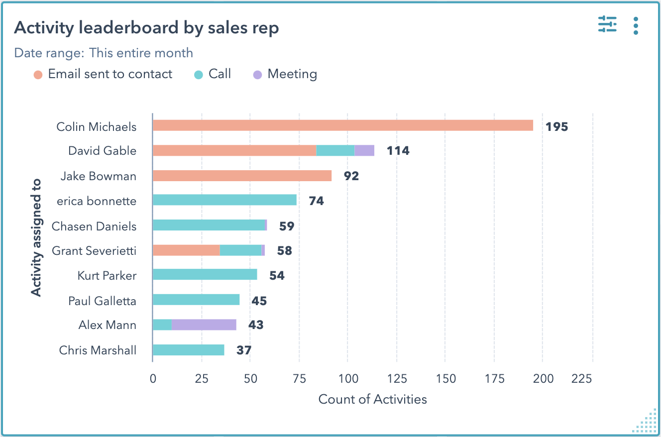 Kixie already automatically logs calls, text messages, call outcomes, and activities in HubSpot, so you can see reports on your reps’ activity in HubSpot’s native reporting features. This means you can see, for example, graphs of activity by rep that include calls, texts, and emails; or reports on the total numbers of different call outcomes each rep has had over a given time period: