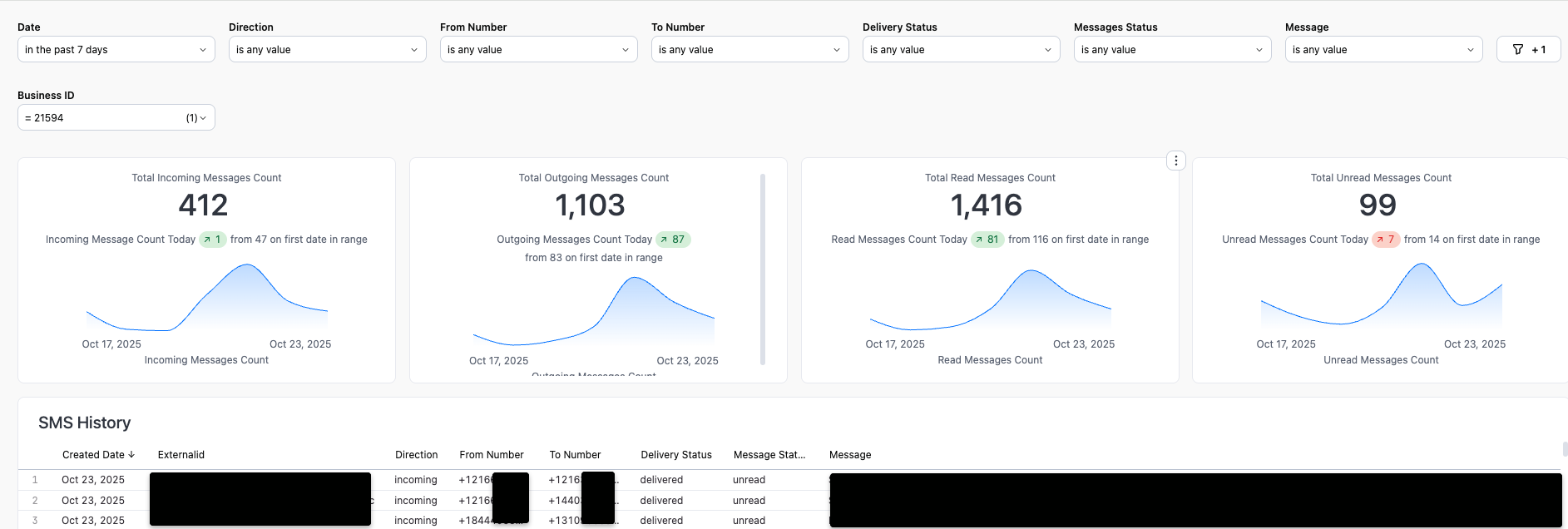 - SMS History Dashboard — message delivery, engagement, inbound/outbound patterns, and template/timing performance.
