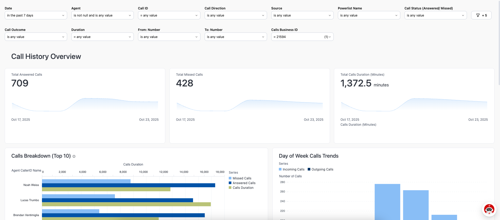 - Call History Dashboard — total calls, missed vs answered ratios, response times, talk-time trends, and rep performance at a glance.