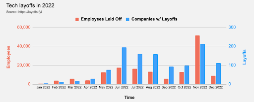 Internally, companies often re-evaluate their headcount during recessions in order to cut costs. While very unfortunate for those being laid off, it’s something we’re familiar with in 2022, with a spike of workers being let go in November of this year: